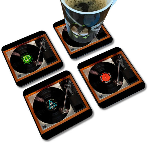 ABOUT THESE COASTERS A quirky set of Music Coasters. Our unique LP coasters have images of a record player with different vinyl records on play. ...